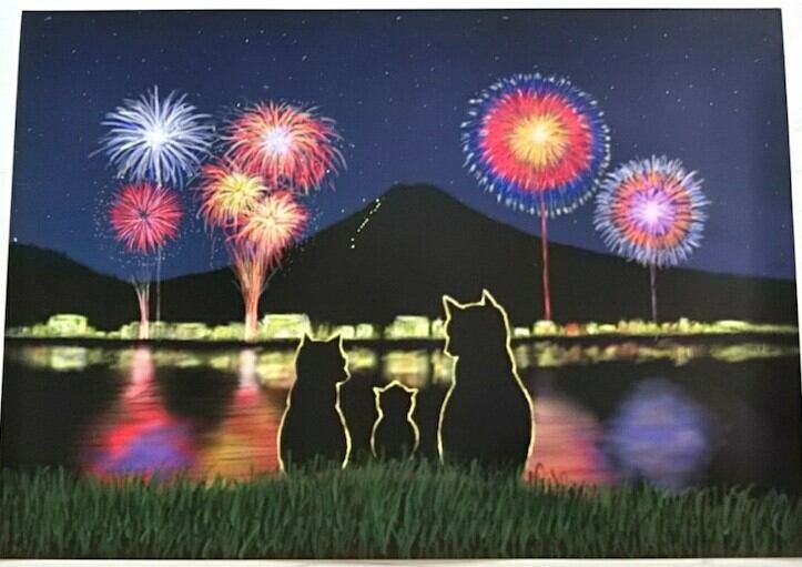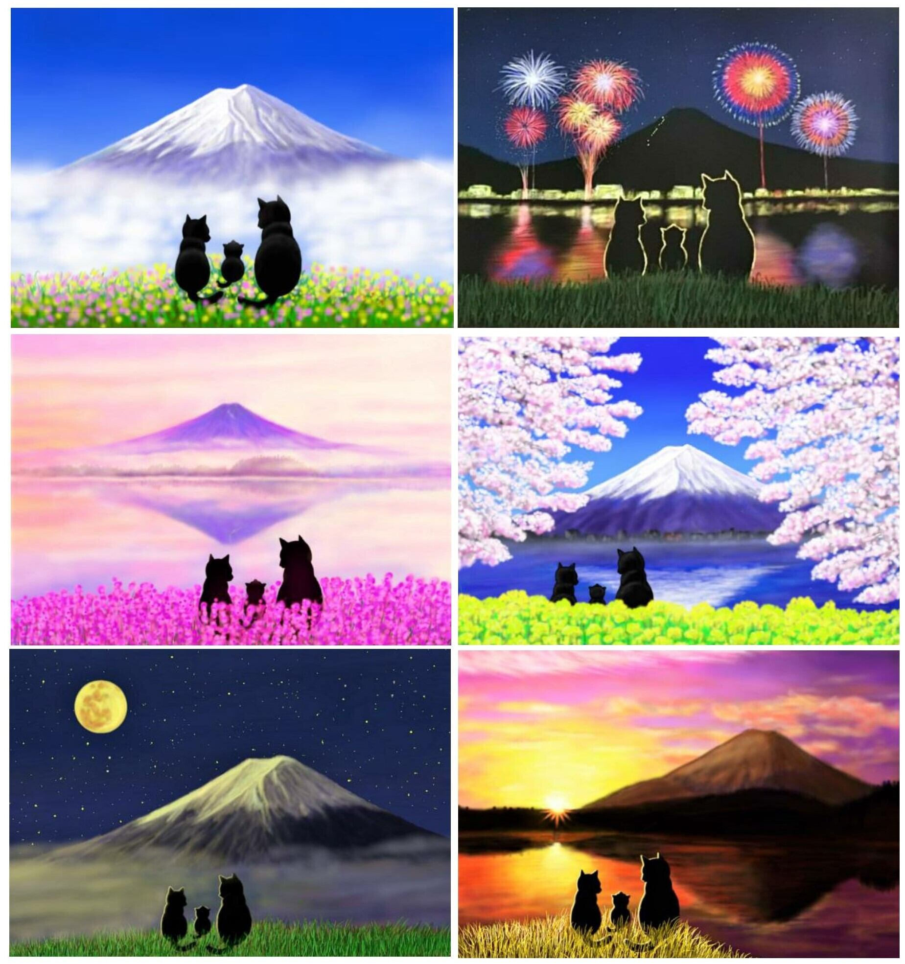 ・まん丸い満月に照らされている富士山を見ている親子猫