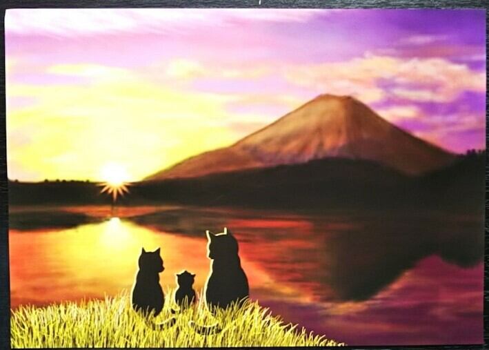 ・精進湖畔から初日の出を見ている親子猫